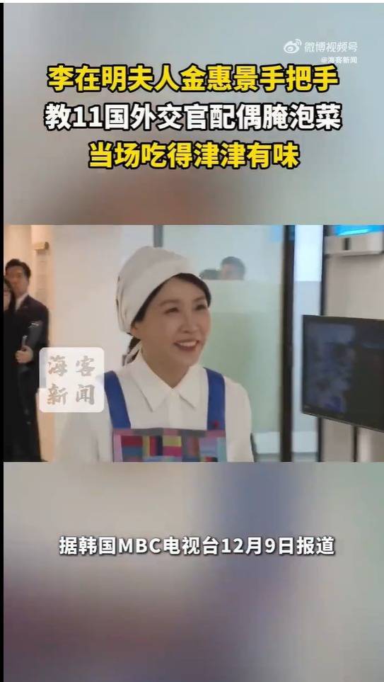 视频画面显示,现场准备了白菜以及水煮猪肉、白豆腐等食材。金惠景在此次活动中当场制作泡菜,还与其他外交官夫人一起试吃。来自日本、英国、法国等11个国家的大使夫人出席了此次活动。