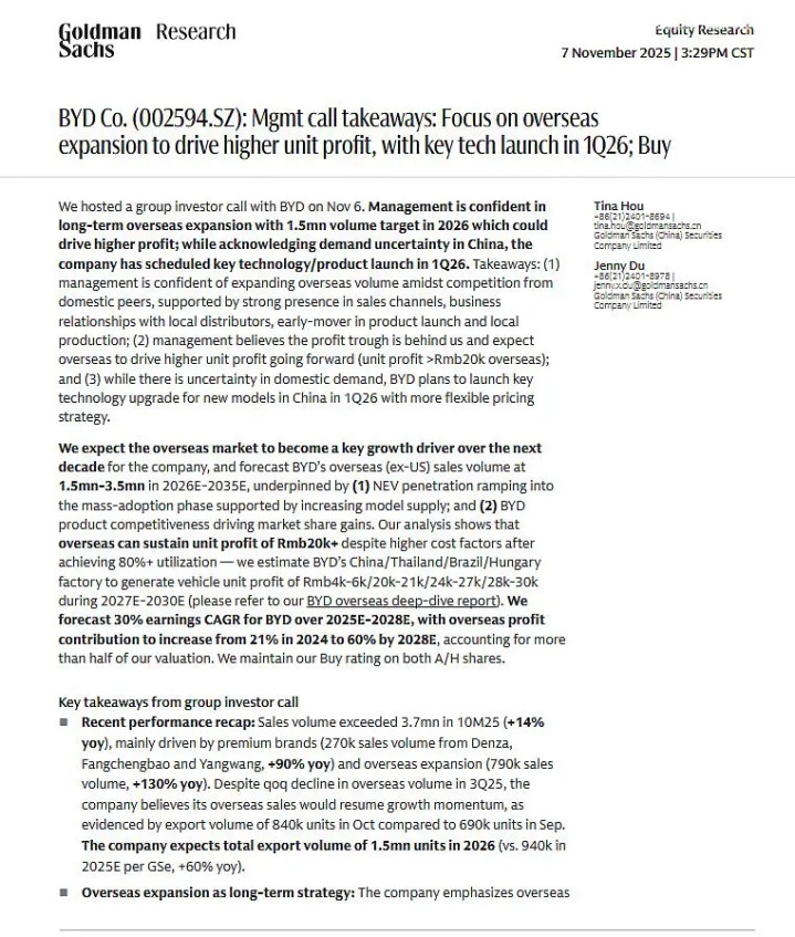高盛在11月7日的研报中明确指出:海外市场将成为比亚迪未来十年的核心增长领域,依托完善的车型矩阵与强大的产品力,比亚迪2025年至2028年盈利年均复合增长率将达30%忆速配,海外利润贡献度将从2024年的21%升至2028年的60%,2026至2035年海外销量有望达150万至350万辆,为此高盛坚定维持其A股、H股“买入”评级,A股目标价144元人民币,相较于12月9日收盘价仍有约50%上涨空间,体现出其对于比亚迪未来市场价值的高度认同。